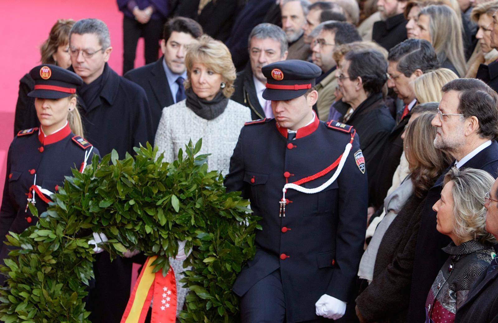 La presidenta de la Comunidad, Esperanza Aguirre y el alcalde de Madrid, Alberto Ruiz-Gallardón, han sido los encargados de depositar una corona de laurel sobre la placa en homenaje a las víctimas de los atentados terroristas del 11 de Marzo de 2004.