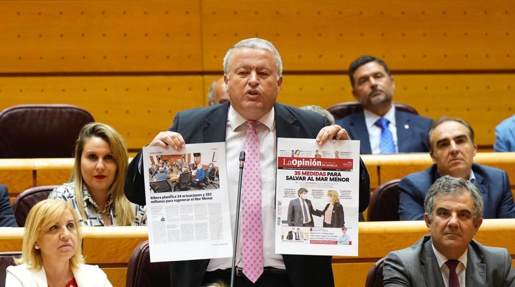 El senador murciano ha recordado a la vicepresidenta que era la cuarta vez que preguntaba por la laguna salada en la Cámara Alta. “La triste realidad es que ustedes no quieren arreglar el Mar Menor y lo único que pretenden es sacar rédito político de esta situación buscando hacerle daño al Partido Popular”.