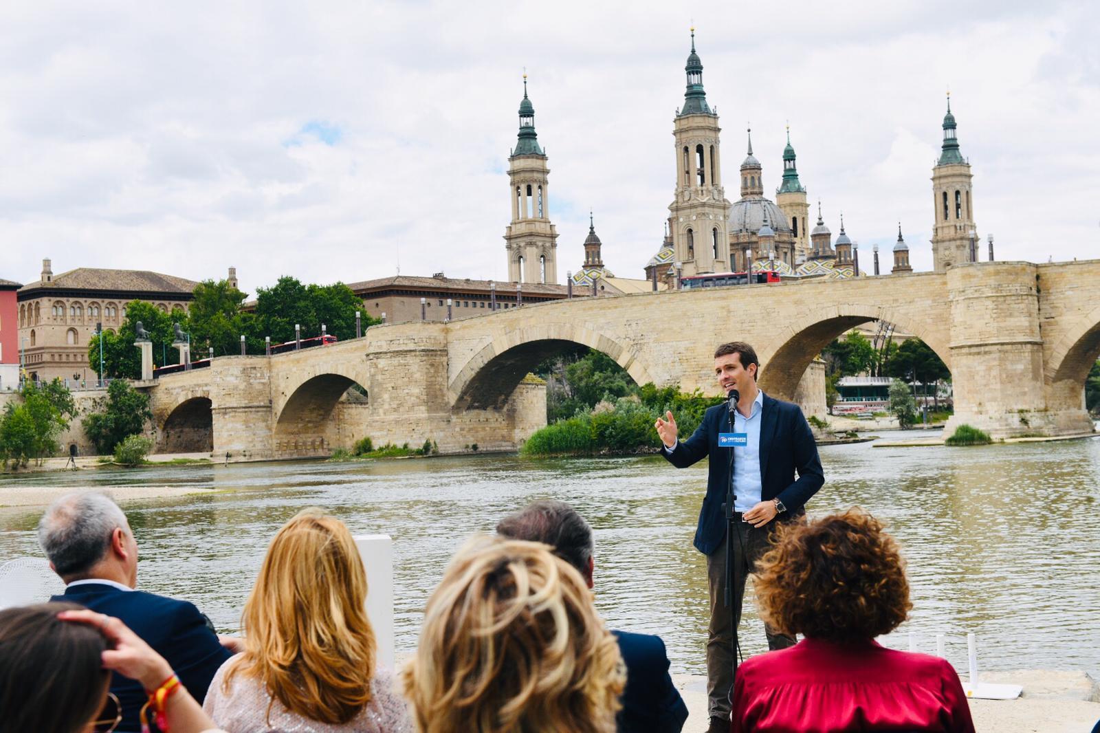 Desde el balcón de San Lázaro, a orillas del río Ebro, Pablo Casado ha explicado que “nadie va a levantar fronteras en el Ebro, no queremos ver proyectos nacionalistas, supremacistas o empequeñecerles”. Por este motivo, Pablo Casado ha pedido a Sánchez “que deje de hacer gestos a los independentistas como si fueran la mayoría en Cataluña, porque lo que quieren es romper la igualdad de los españoles y dividir a nuestro país”. “Pertenecemos al mayor espacio de prosperidad e igualdad, la Unión Europea”, ha añadido.