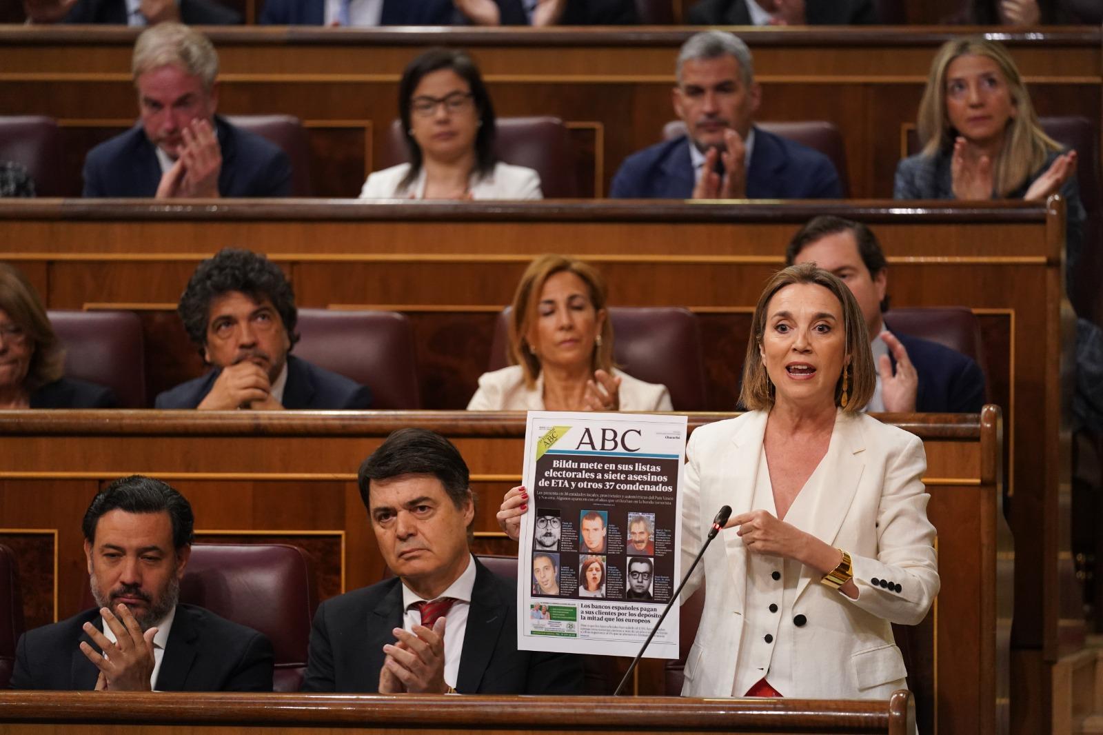“Paga incluso a Bildu, que se presenta a las próximas elecciones con 44 terroristas en sus listas electorales”, subraya Gamarra, quien muestra a Sánchez las fotos de algunos de ellos: “Estos son sus socios, este es el cartel electoral con el que se presenta su partido, estos son sus socios para el próximo 28 de mayo”