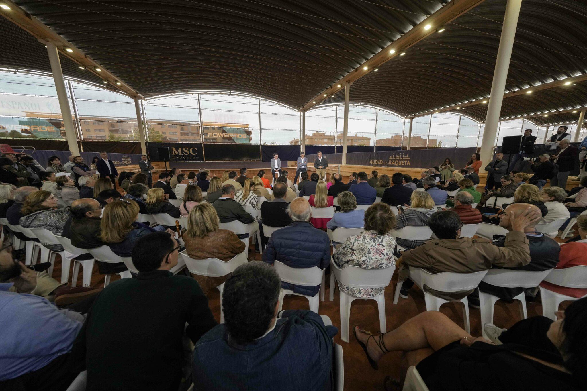 Alberto Núñez Feijóo en un acto en la Ciudad de la Raqueta con el alcalde de Madrid, Almeida, y Toni Nadal.