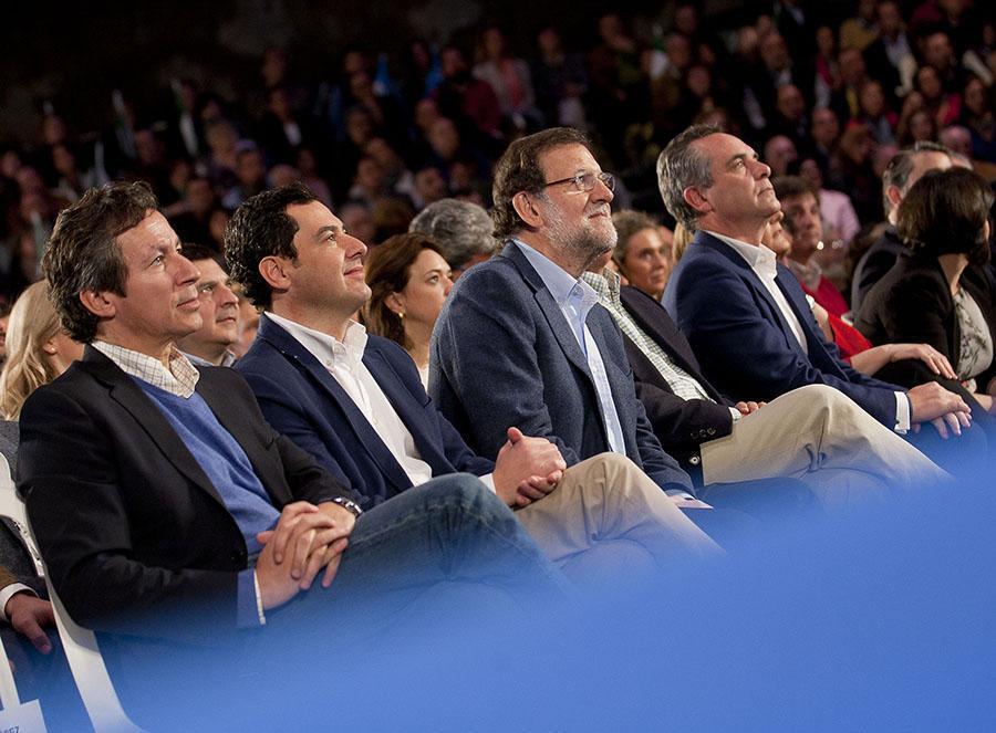 Carlos Floriano, Juanma Moreno y Mariano Rajoy en el acto de Sevilla