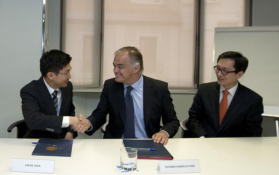 Esteban González Pons en la firma del acuerdo del PP con el Partido Saenuri de Corea