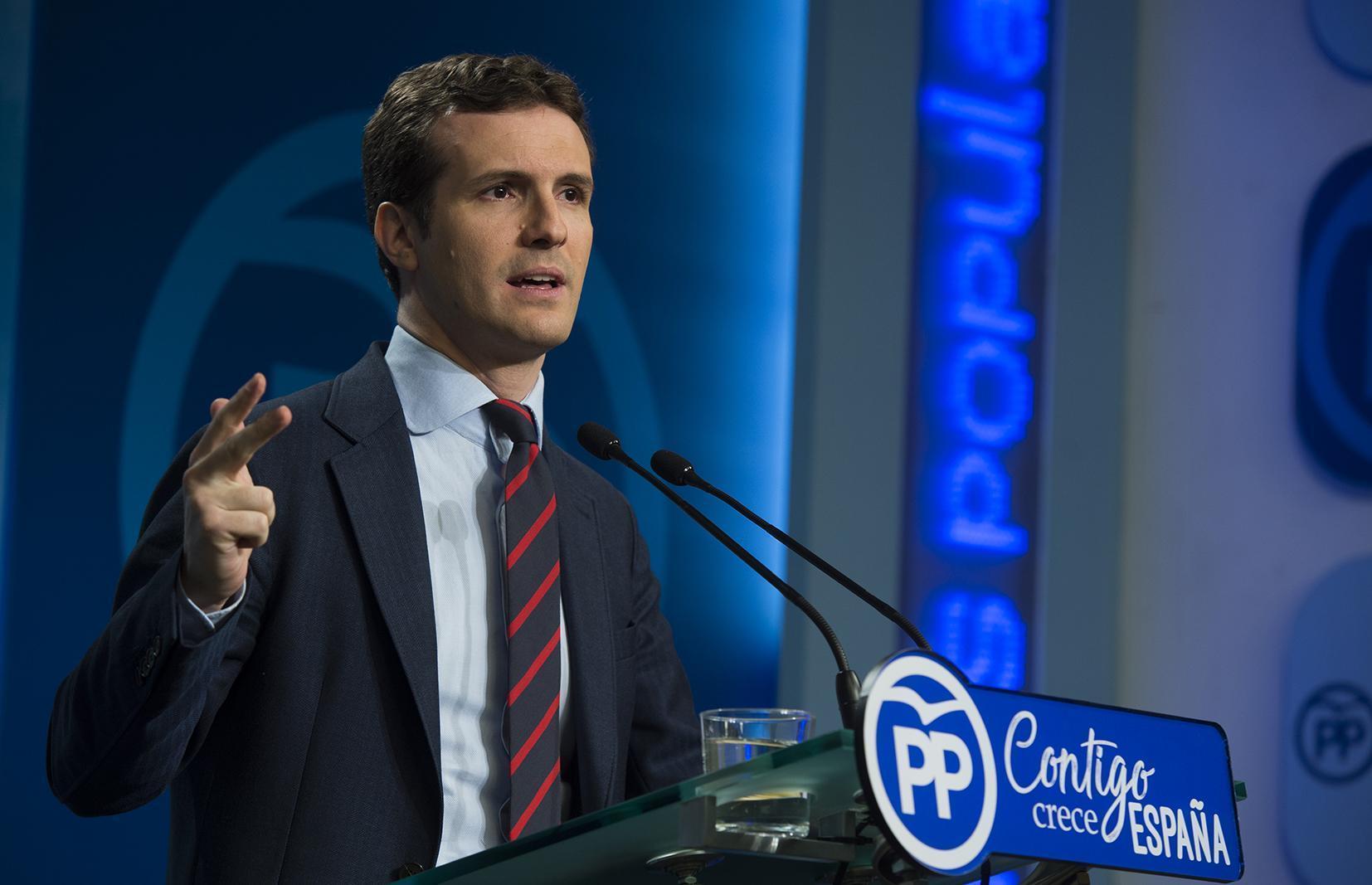 El vicesecretario de Comunicación del Partido Popular, Pablo Casado, en rueda de prensa en la sede nacional del PP