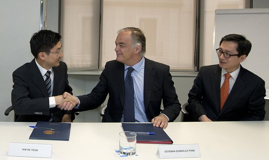 Esteban González Pons en la firma del acuerdo del PP con el Partido Saenuri de Corea