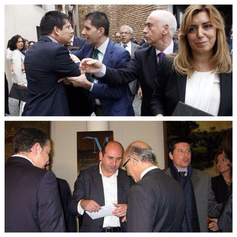 Imagen superior: Fran Oblaré (PP) al que no le han permitido acercarse a Susana Díaz para entregarle una carta de los alcaldes populares malagueños. Inferior: Cristóbal Montoro recibiendo personal