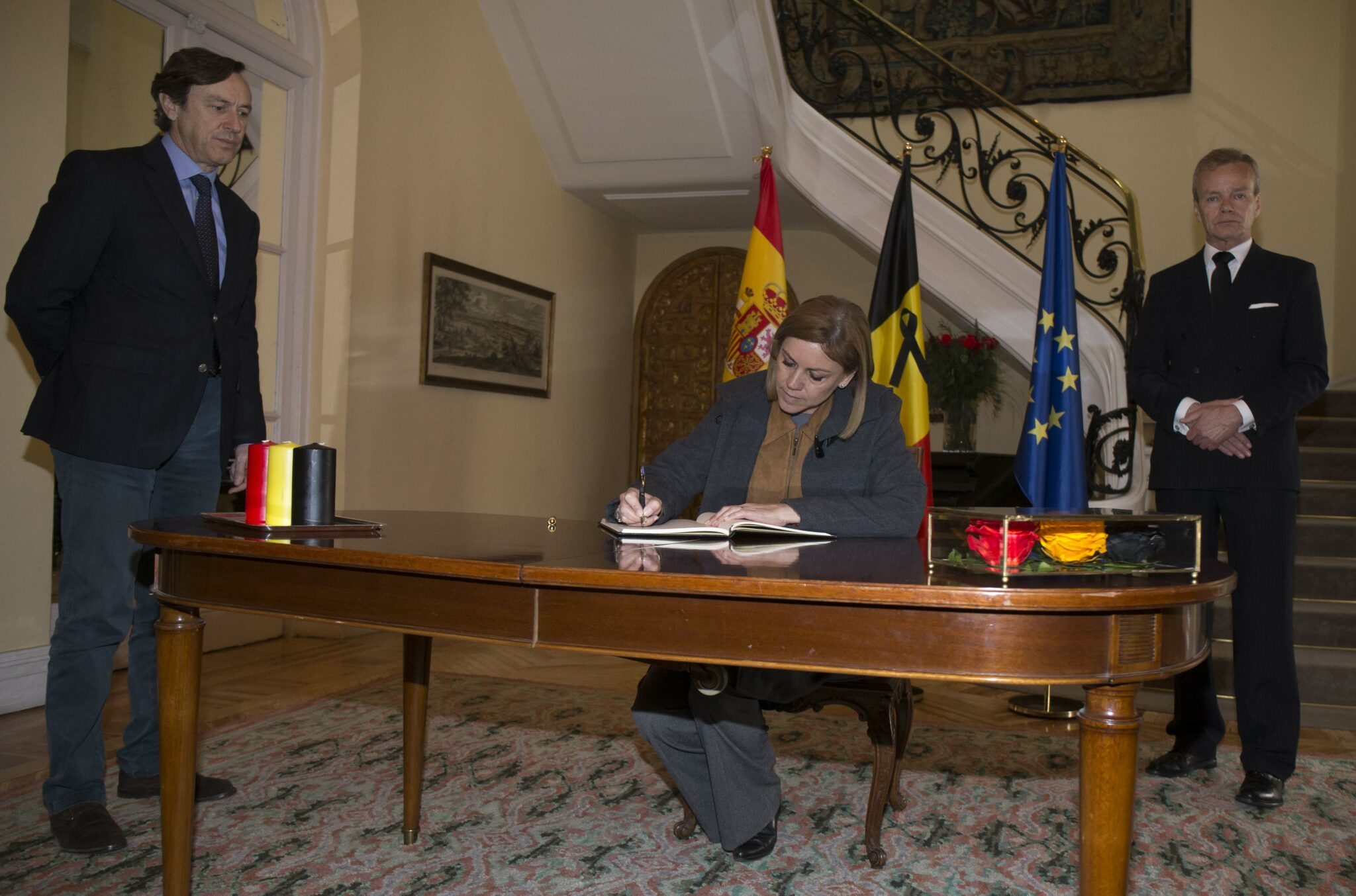 María Dolores Cospedal firma en el Libro de Condolencias en la residencia del embajador de Bélgica en España, Pierre Labouverie