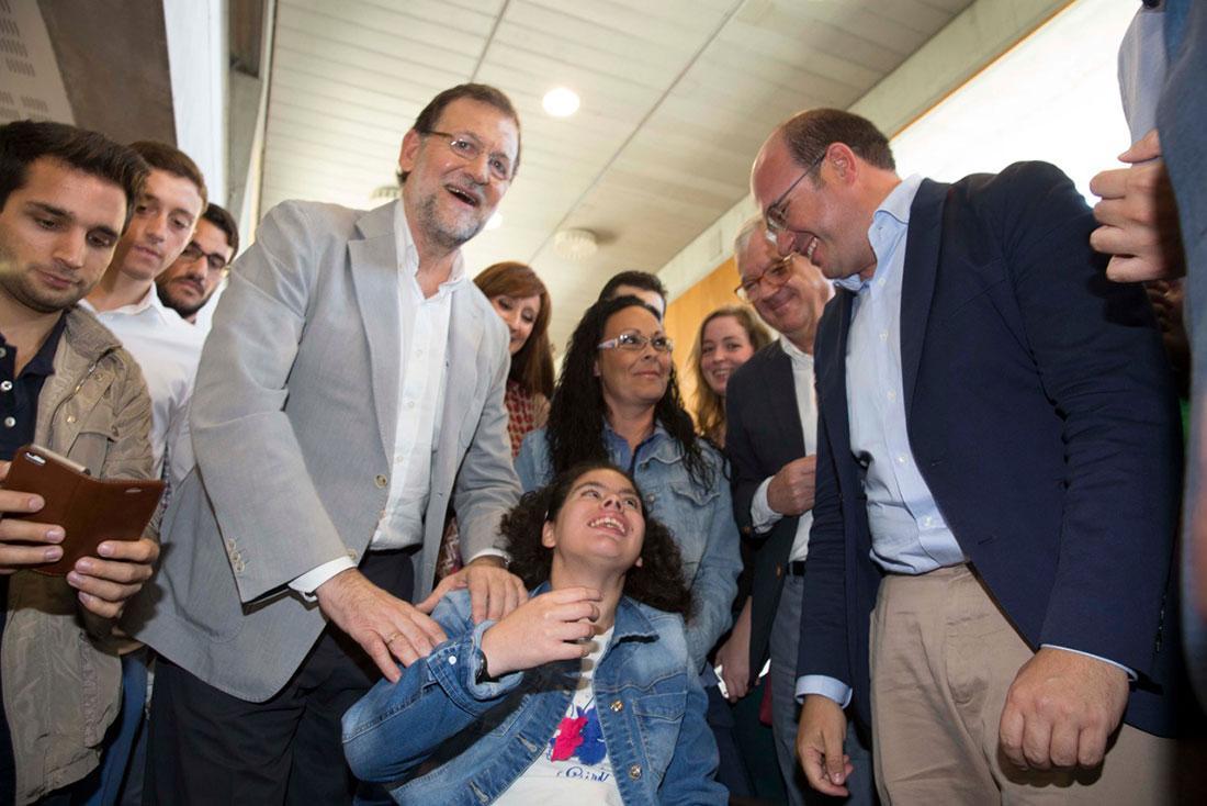 Mariano Rajoy junto a Carmen Gonzálvez López que votará por primera vez el 24M y Pedro Antonio Sánchez en Murcia
