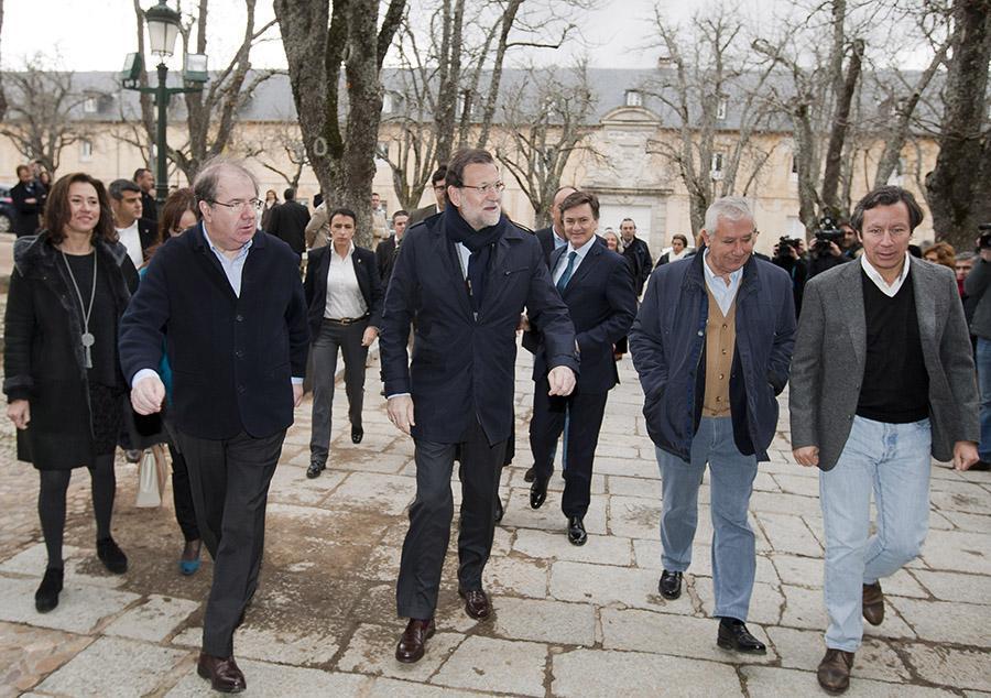 Mariano Rajoy a su llegada a La Granja junto a Carlos Floriano, Javier Arenas y Juan Vicente Herrera