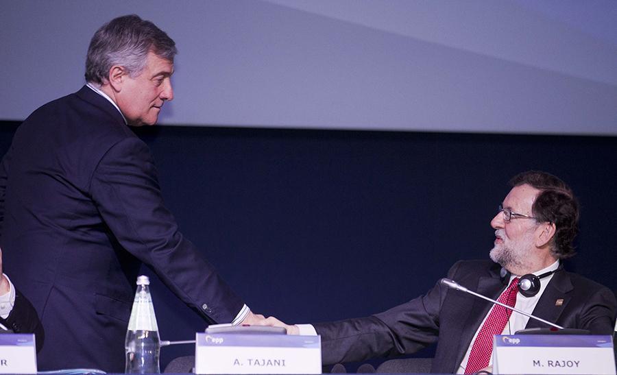 Mariano Rajoy saluda a Antonio Tajani en el Congreso del PPE en Malta
