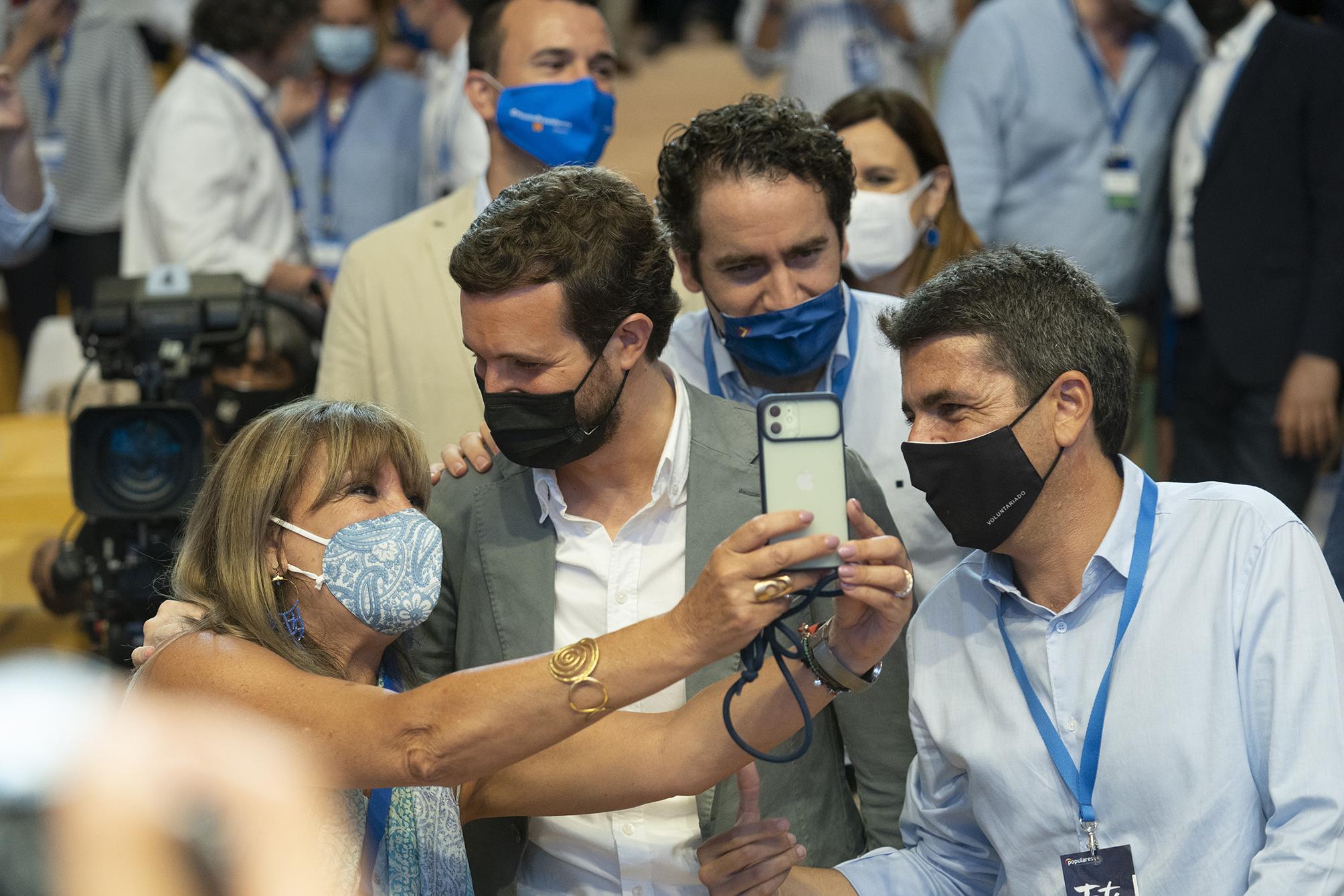 Pablo Casado, a su llegada al XV Congreso del Partido Popular de la Comunidad Valenciana, junto a Teodoro García Egea y el nuevo presidente regional, Carlos Mazón