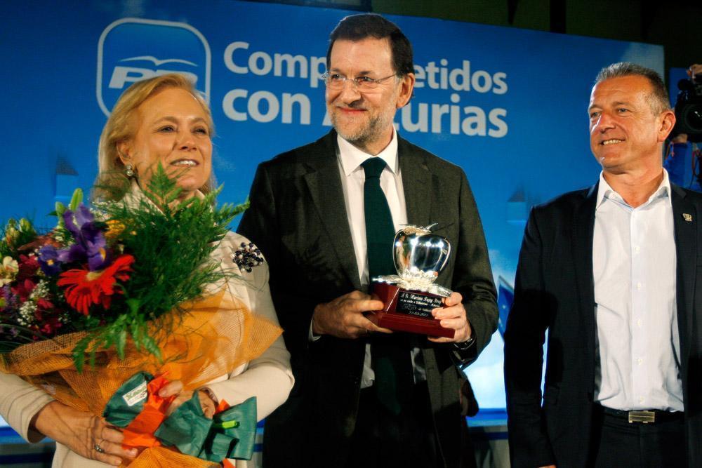 El presidente del PP, Mariano Rajoy, junto a Mercedes Fernández al finalizar el mitin