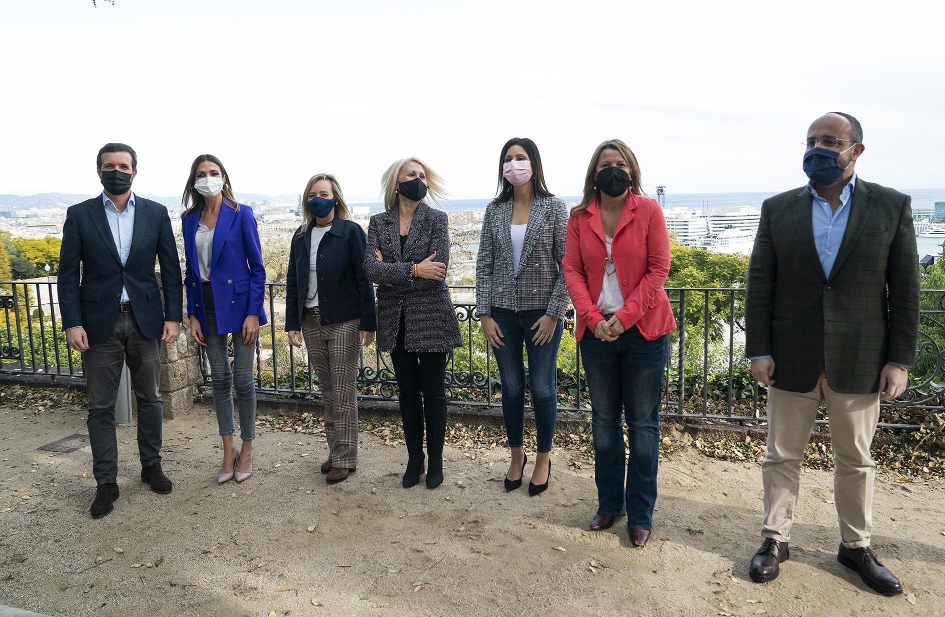 El presidente del Partido Popular, Pablo Casado, en la presentación de la candidatura del PPC a las elecciones catalanas acompañado por candidatas en la lista y el candidato a la Generalitat, Alejandro Fernández