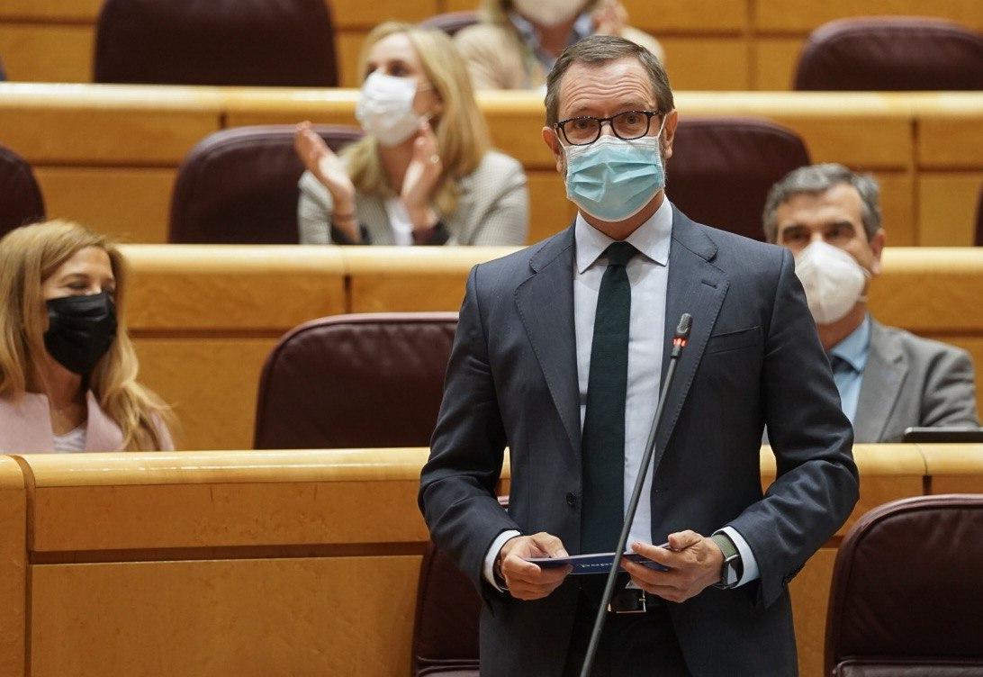 El portavoz popular en el Senado preguntaba al presidente del Gobierno por cómo va a resolver los problemas de los españoles y le ha reprochado que venga al Senado a hacer campaña con su mascarilla FFP2, por la que el resto de los españoles tienen que pagar el 21 por ciento del IVA, “justo con la mascarilla a la que no quisieron reducir el IVA, ¿no es realmente sorprendente?”, ha preguntado.