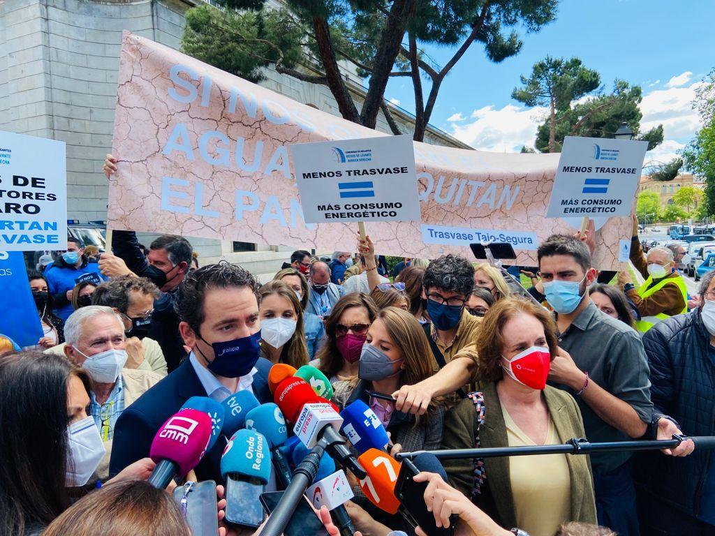 • Junto a los presidentes de la Región de Murcia, Fernando López Miras, y de la Diputación de Alicante, Carlos Mazón, exige que se esté con los consensos, con los acuerdos, para que a ningún agricultor le falte el agua tan necesaria.