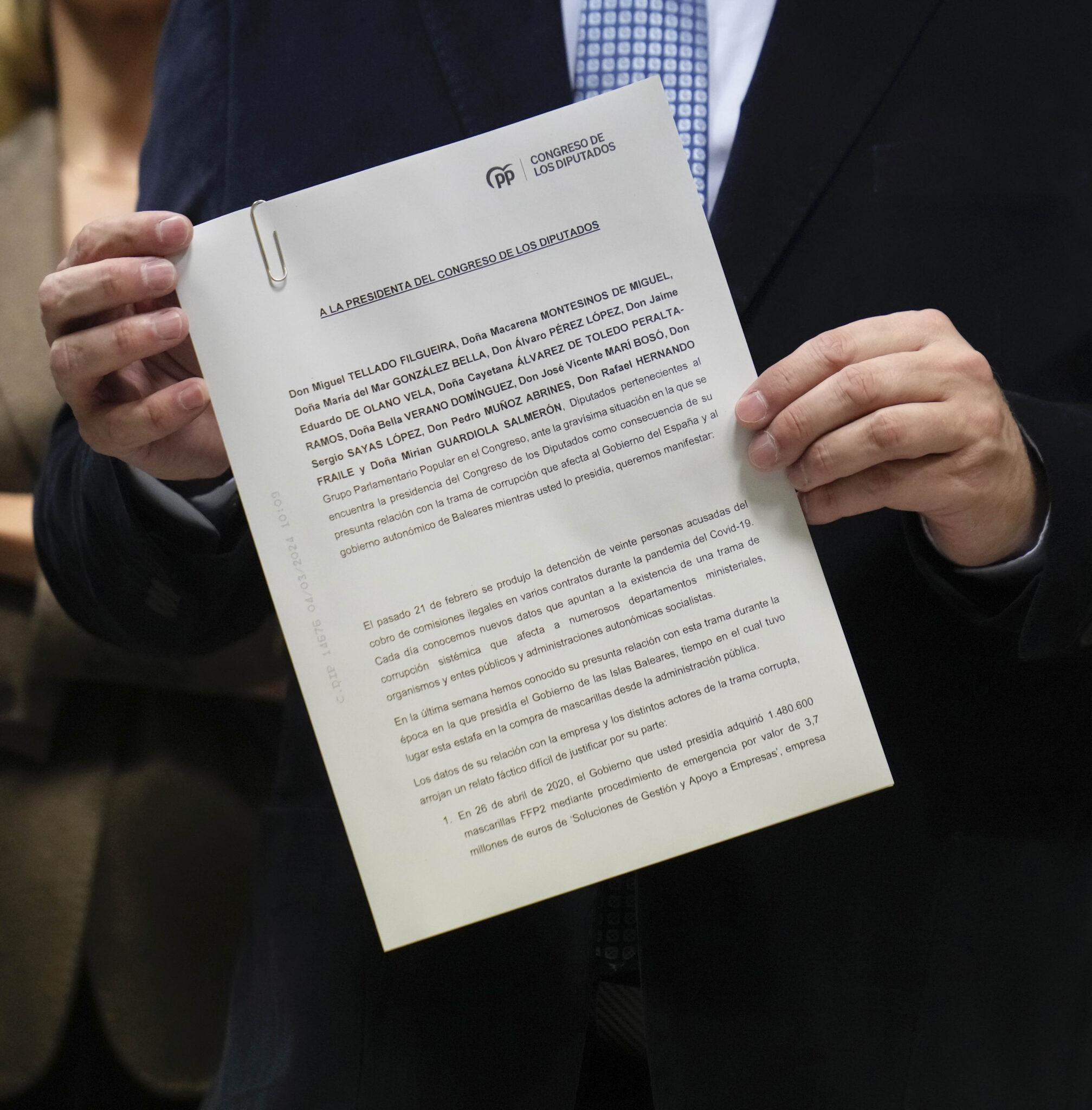 • El portavoz del GPP, Miguel Tellado, afirma que la presidenta del Congreso de los Diputados “no puede seguir un segundo más como tercera autoridad del Estado”. “Estamos ante un escándalo de hondo calado”, señala tras registrar en la Cámara baja un escrito reclamando su inmediata dimisión