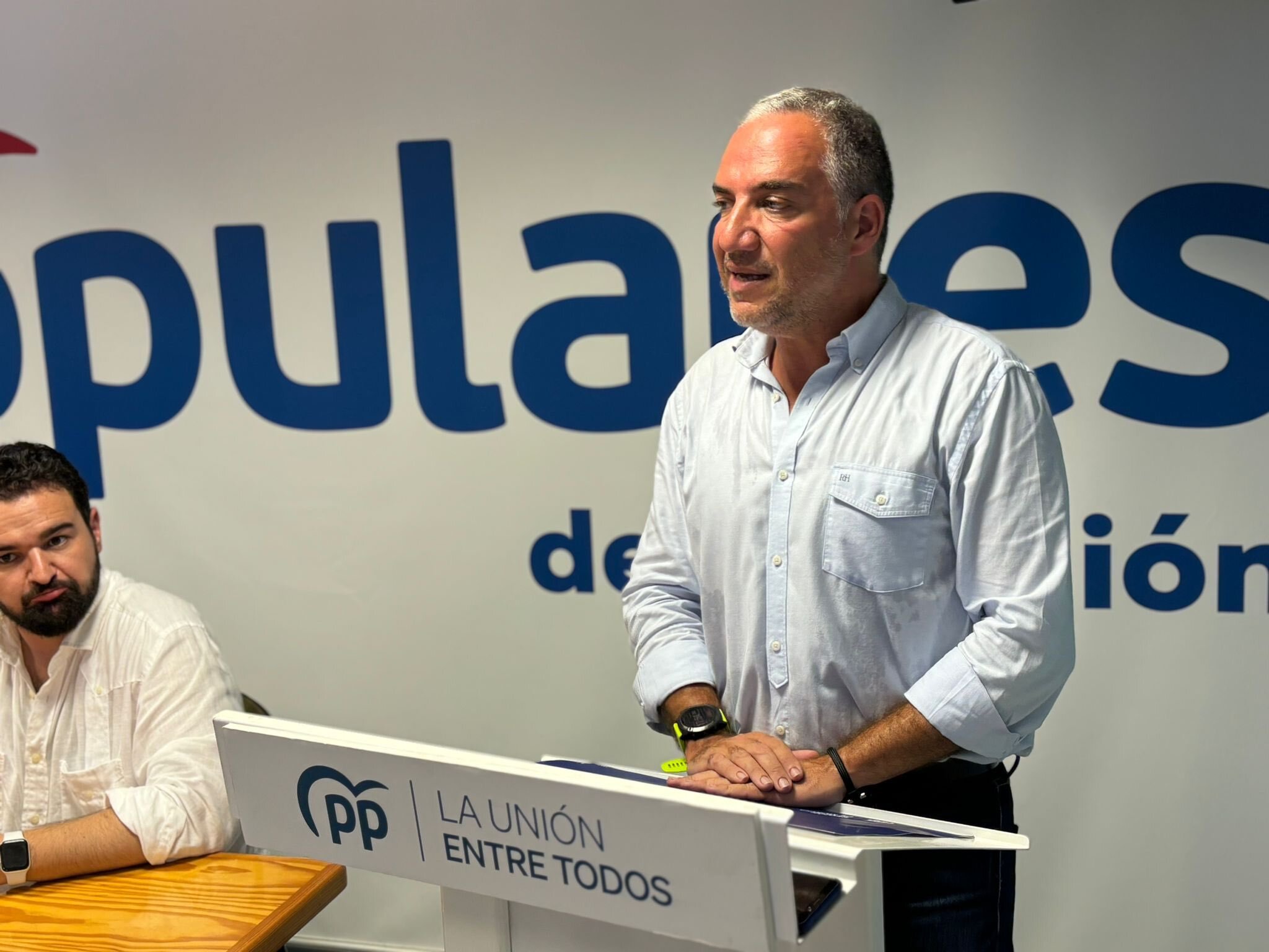 Elías Bendodo atiende a los medios de comunicación en Sevilla.