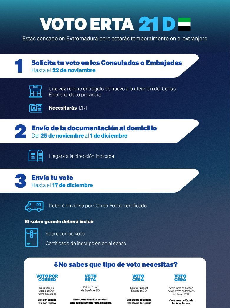 Los electores CERA que se encuentren temporalmente en España podrán solicitar, al igual que los residentes en España, el voto por correo hasta el día 11 de diciembre; pudiendo enviar dicho voto hasta el día 17 de diciembre.